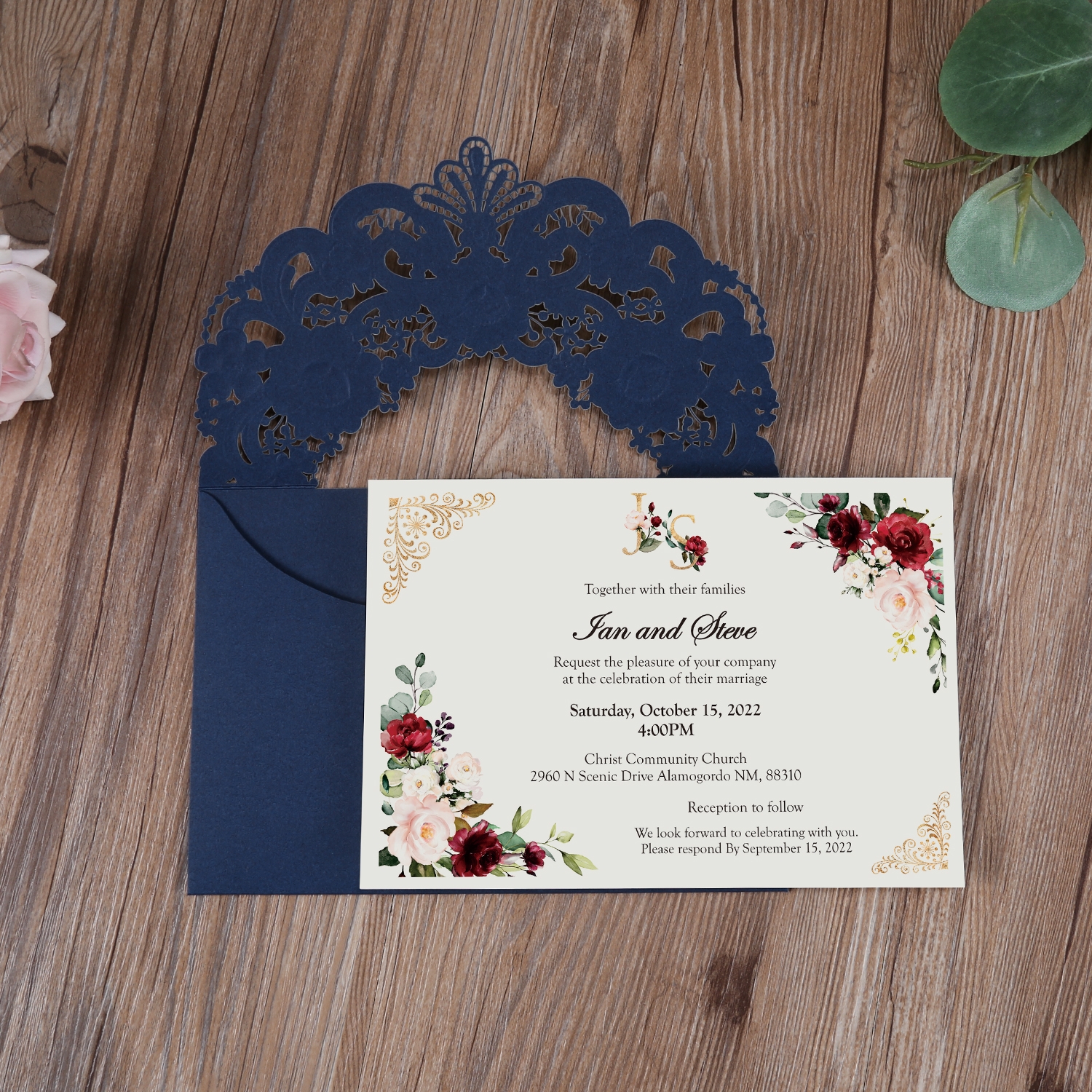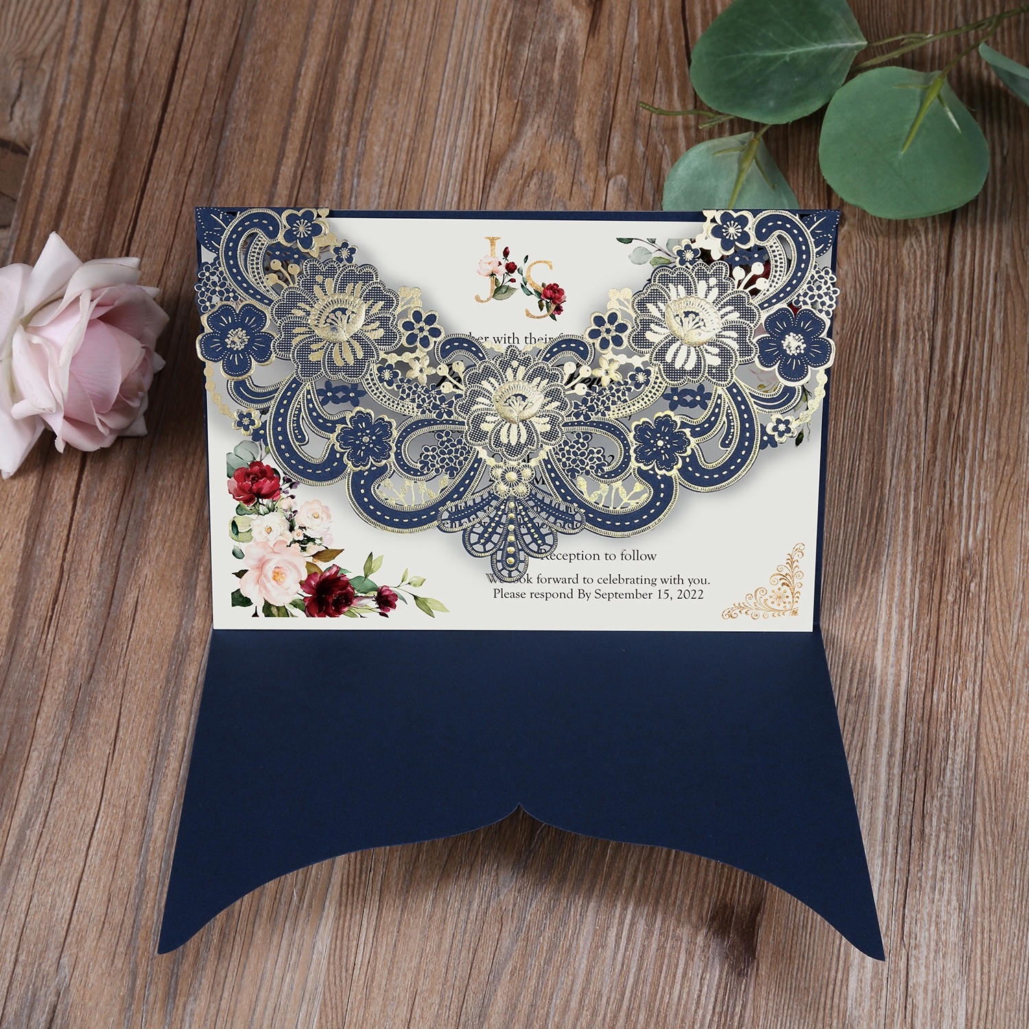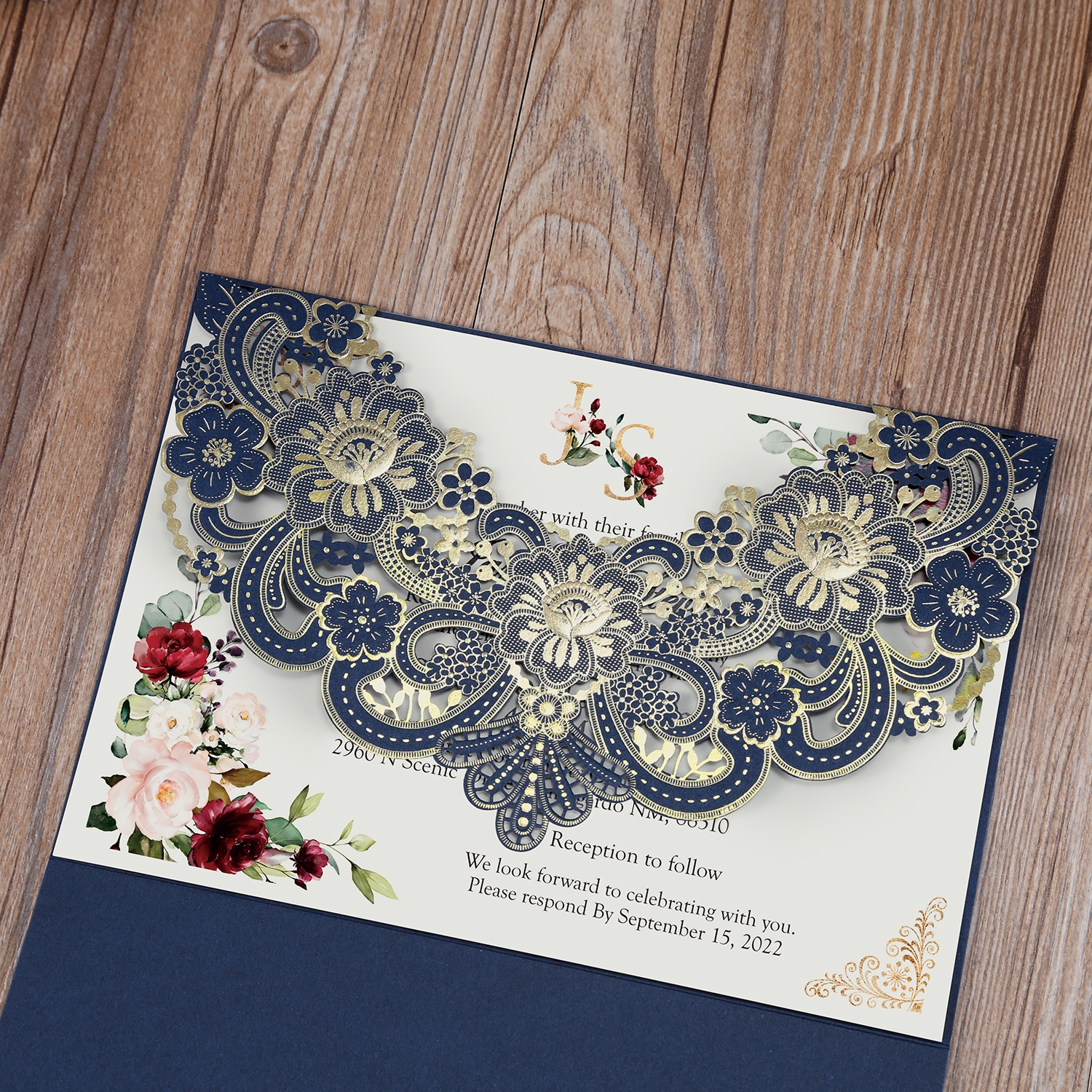 A beautiful lace pattern laser cut to form the necklace of the invitation is very delicate and beguiling. The carved out laser-cut has been carefully done to return an amazingly attractive piece.