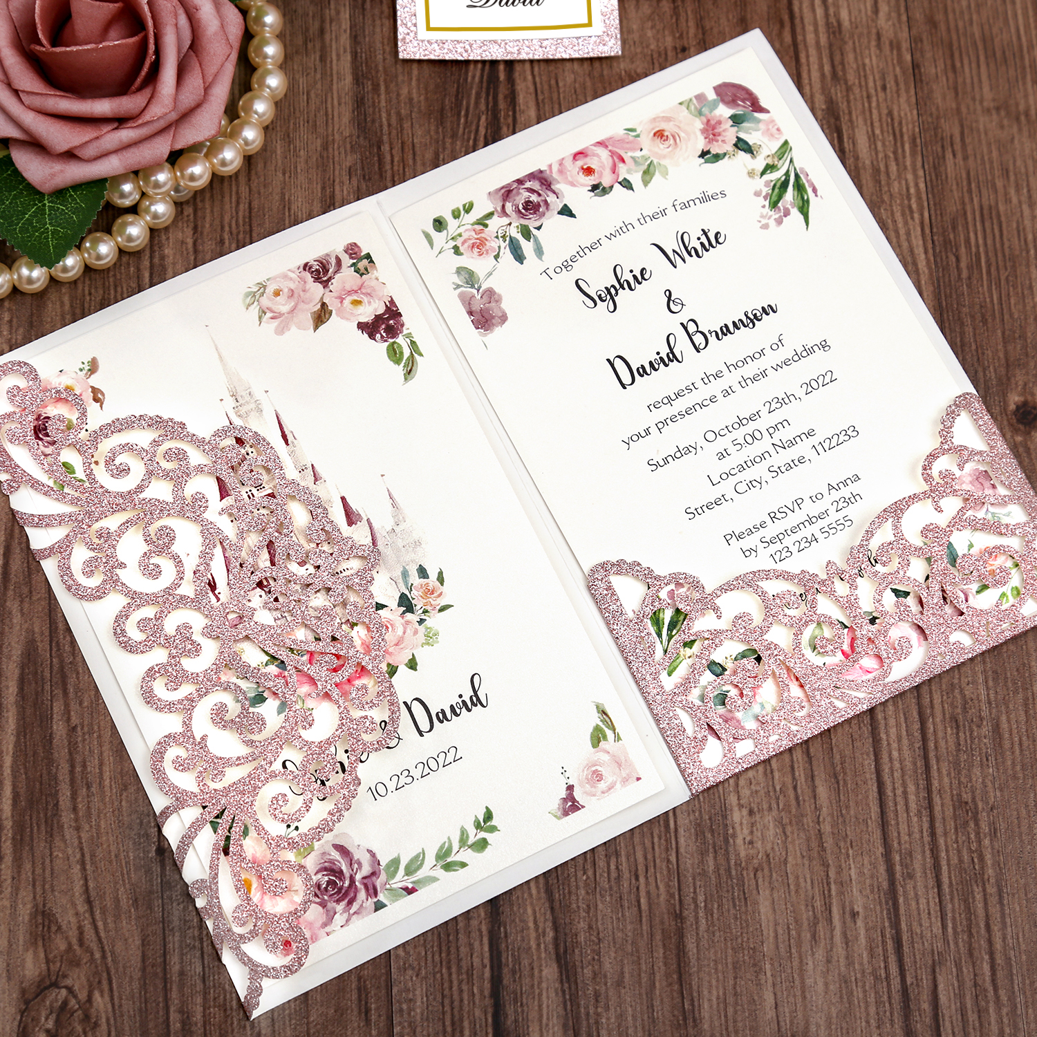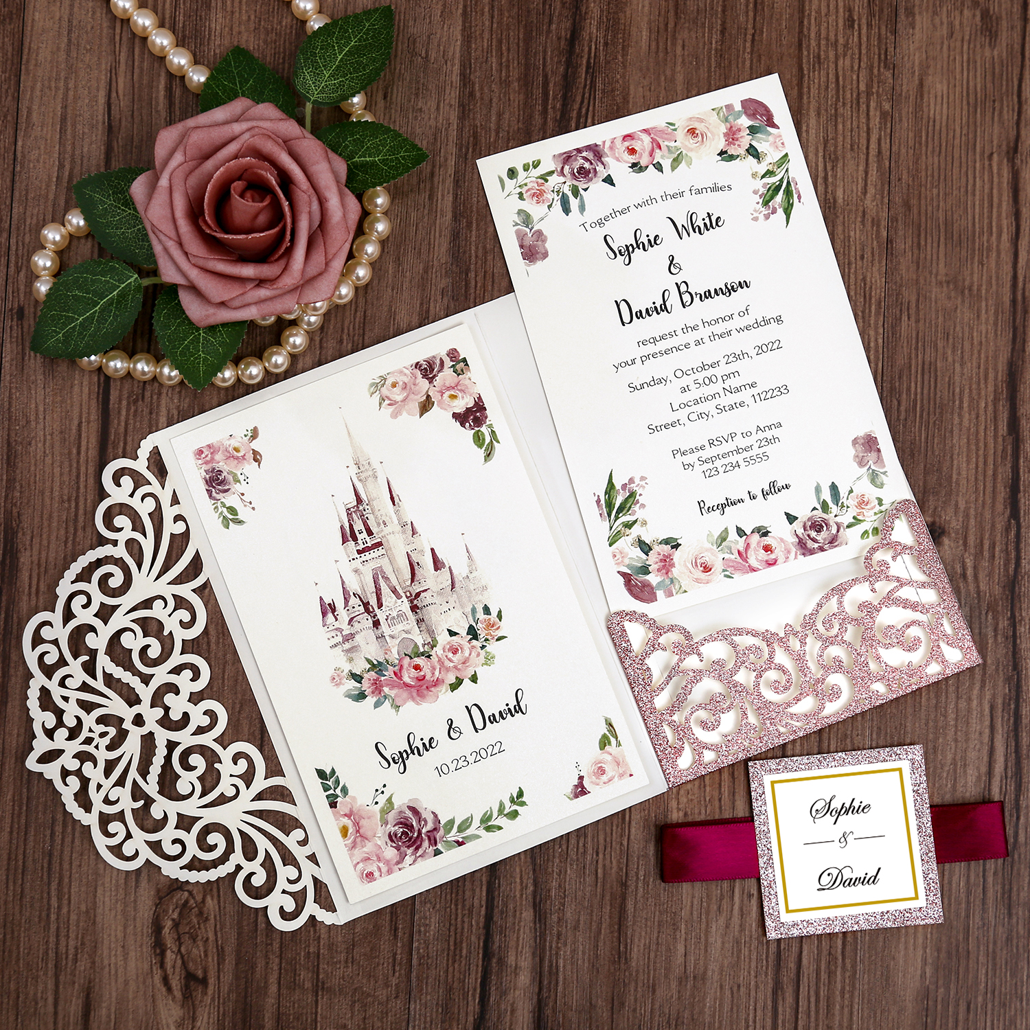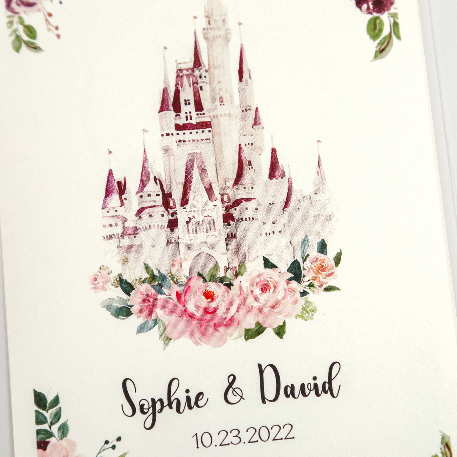 The first window of the card is a laser-cut in the same colour and sparkle. The carving has been done in the shape and design of a crown which opens into a solid outer sheet. Further opening the card has the inner sheet printed and pasted on the left corner. This sheet has a print of a castle in matching shades with the card adding to the regal look. The right side has a laser-cut pocket of similar design as the outer crown that holds the more inner leaves containing event details and your heartfelt note. The content and the number of sheets is customizable. All inner leaves have beautiful pink blooming and blushing flowers and leaves adding to the card’s beauty.