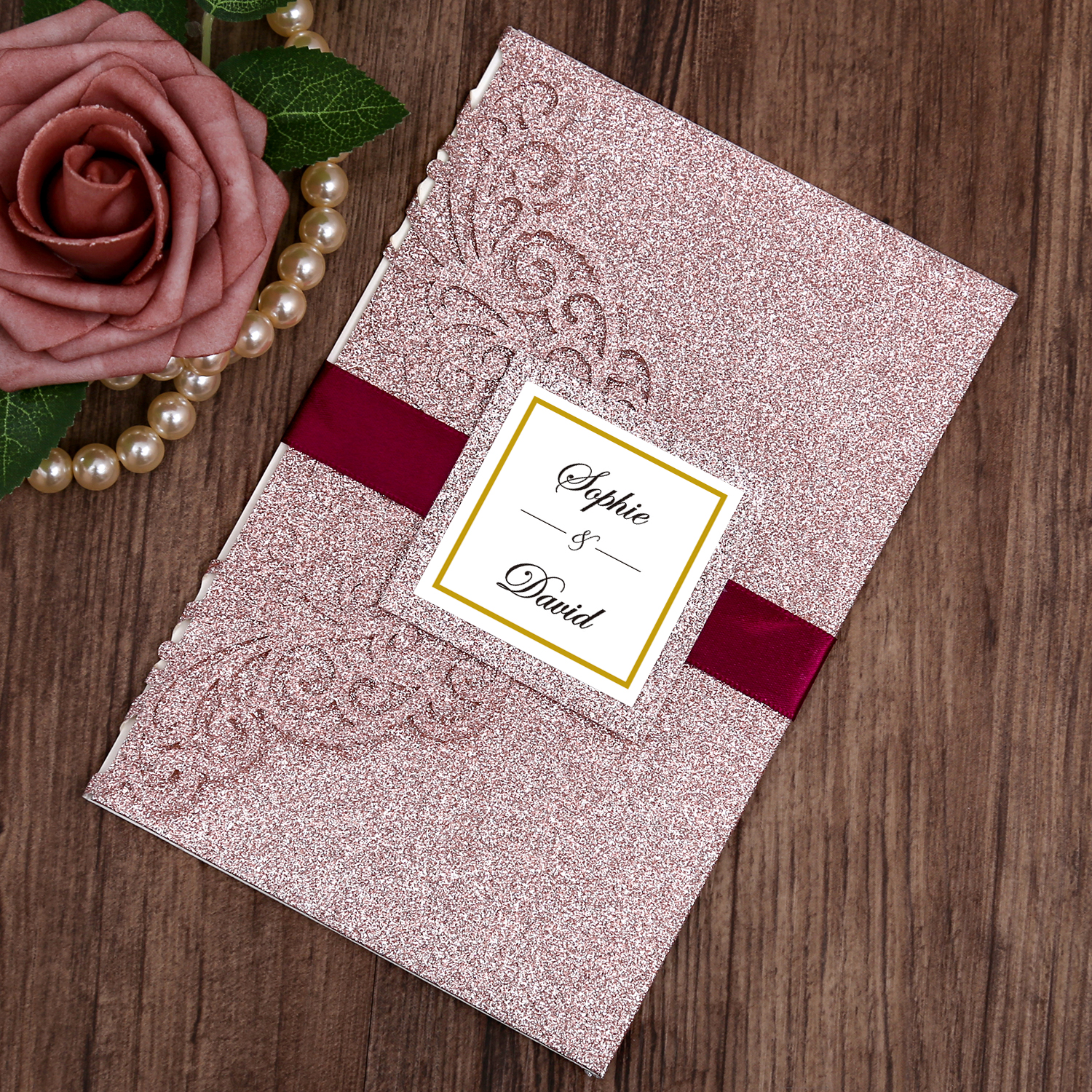 The whole card is held in place with a wide wine-coloured ribbon that has an embellished paper note with the same sparkle as the card. You can write the most important thing on this wealthy addition, like the names of the bride and the groom, Thank you, Save the date, Quinceanera’s name or just the date.