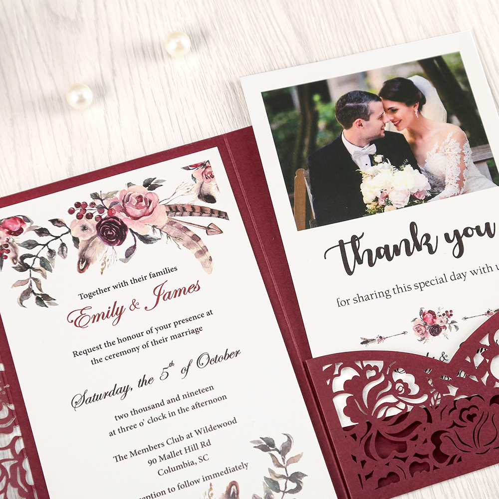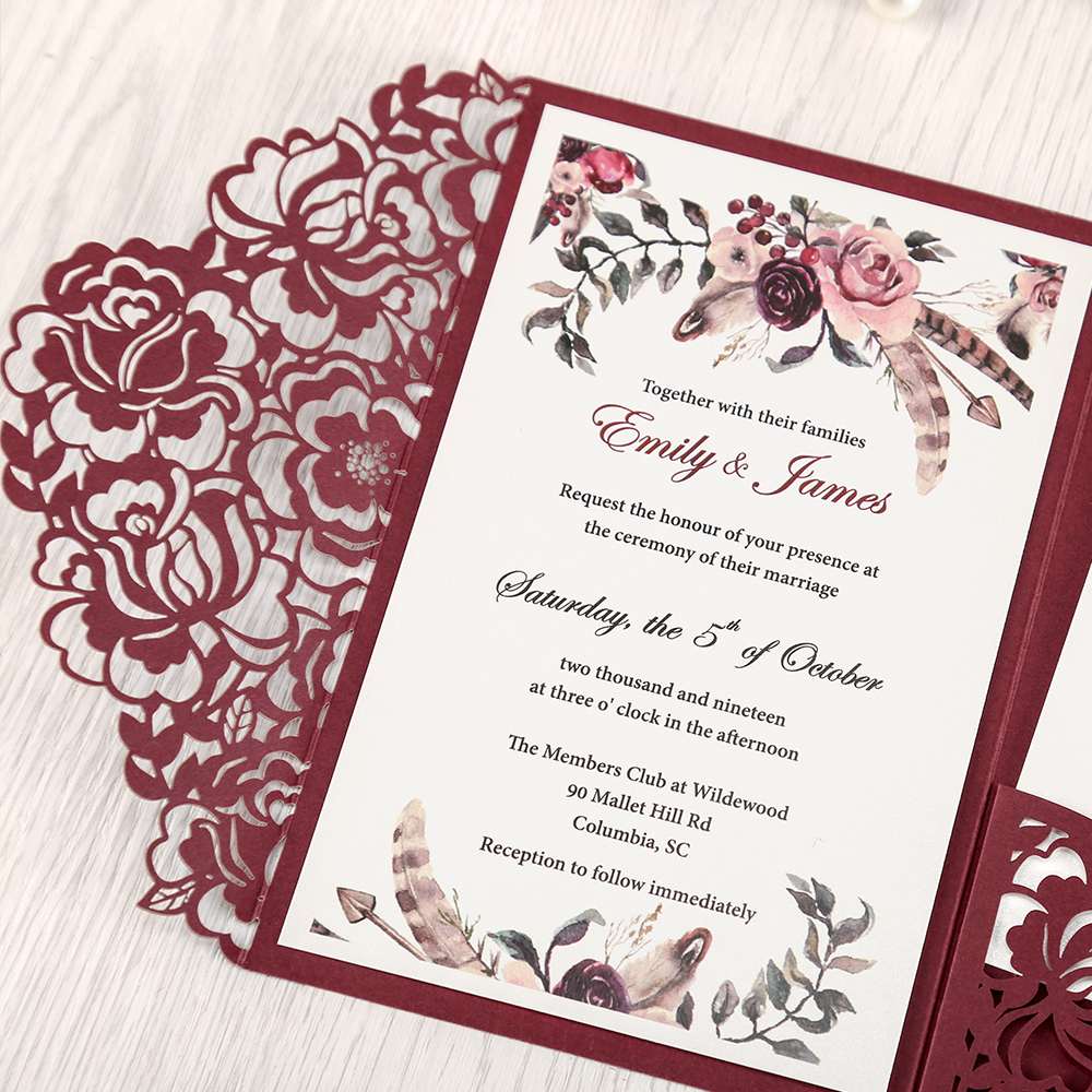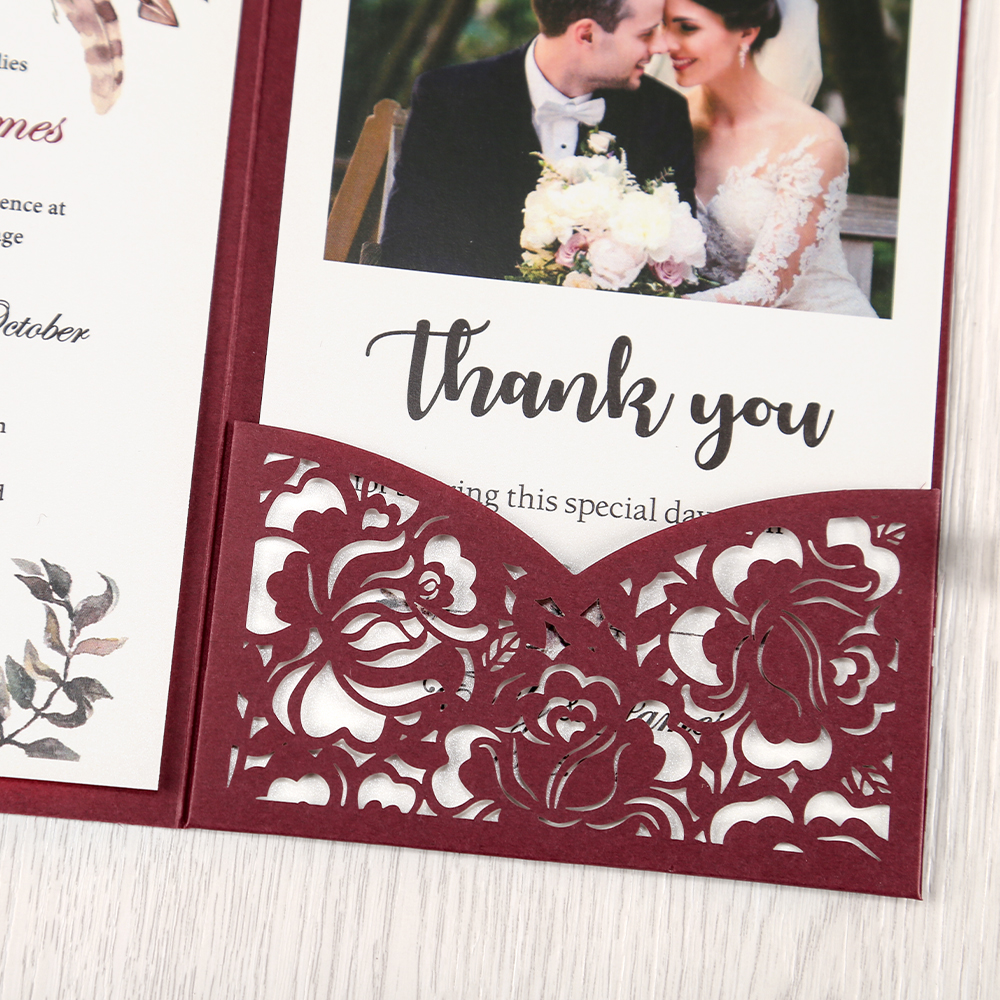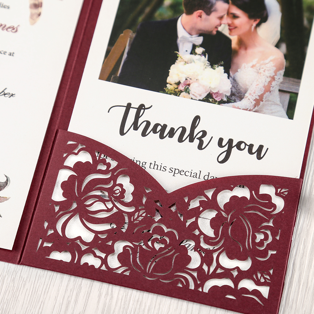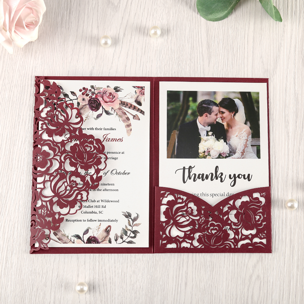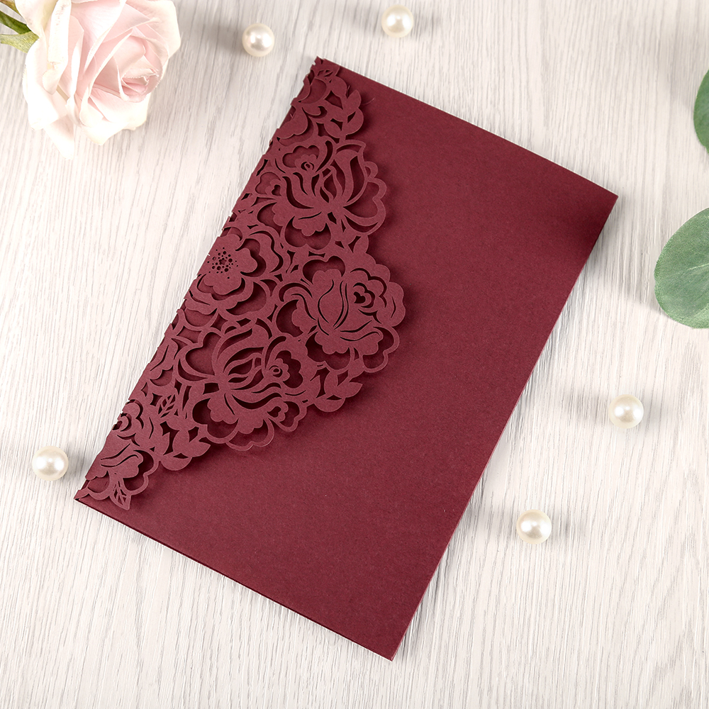 The bright invitation card has been carved out into the blooming roses pattern using the latest laser-cut technology. Each petal is refined and uniquely defined in the whole opening panel. The delicate pattern has been carved on high-quality pearlescent paper to impart strength to the delicate design.