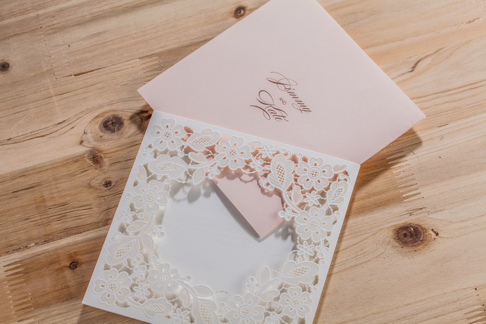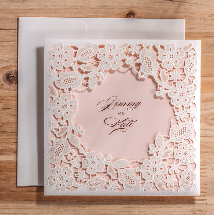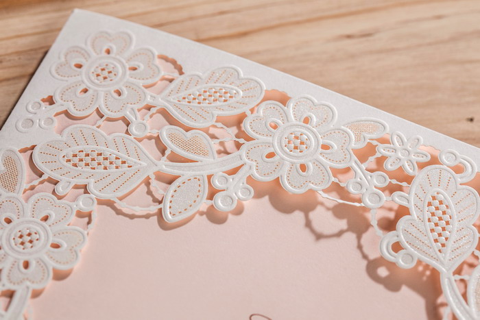 The card has been made using high-quality cardstock paper. The floral pattern lace has been beautifully carved out using the latest laser technology so that all details are visible. The patter monopolizes all the corners leaving a central window to highlight the most important thing speaking what the card stands for.