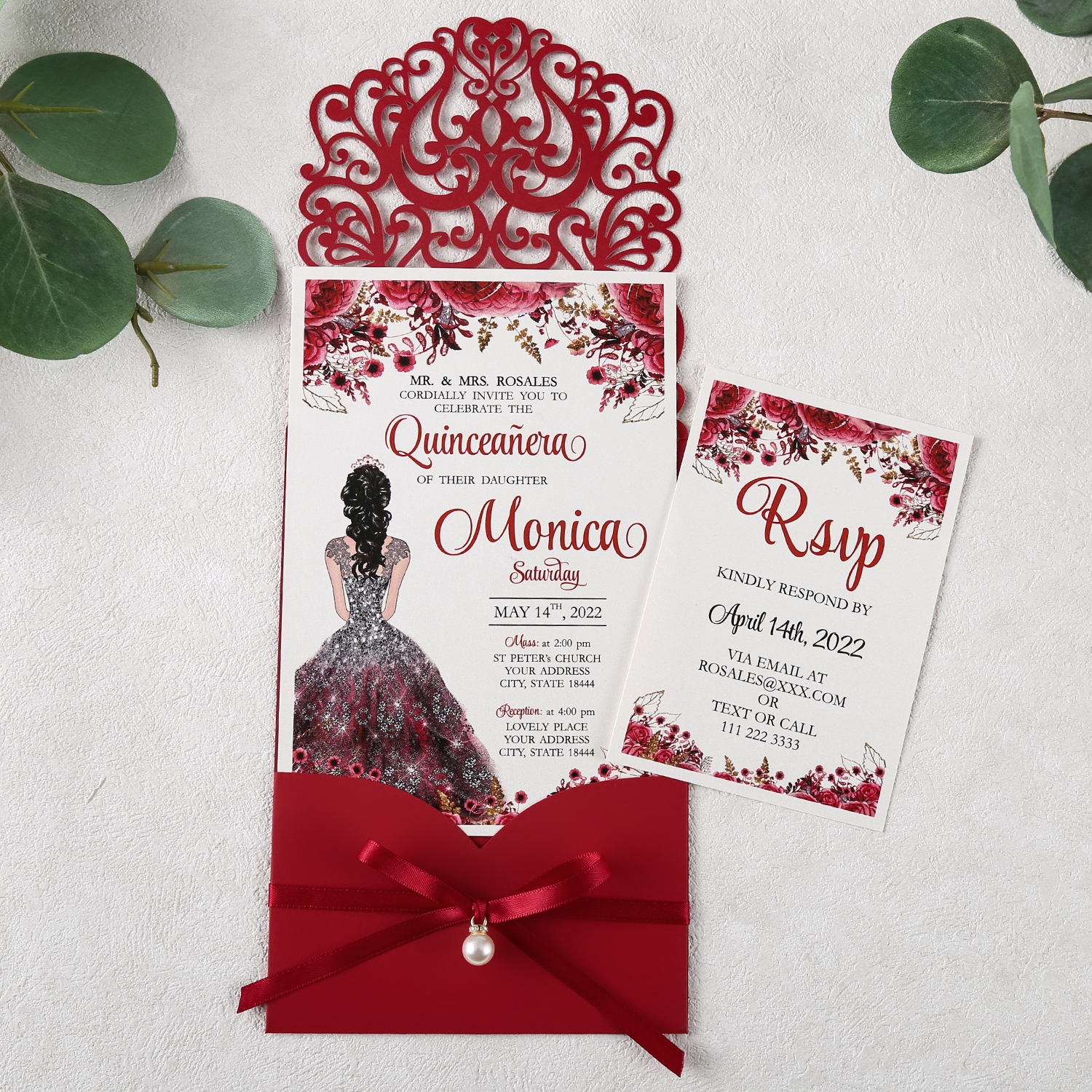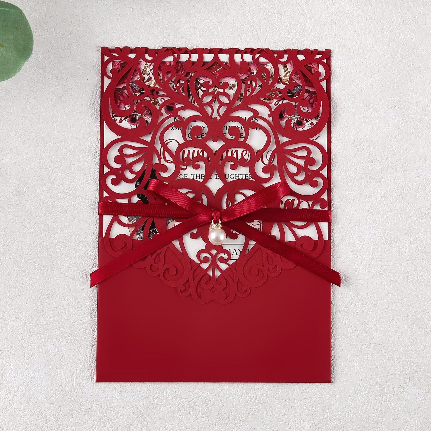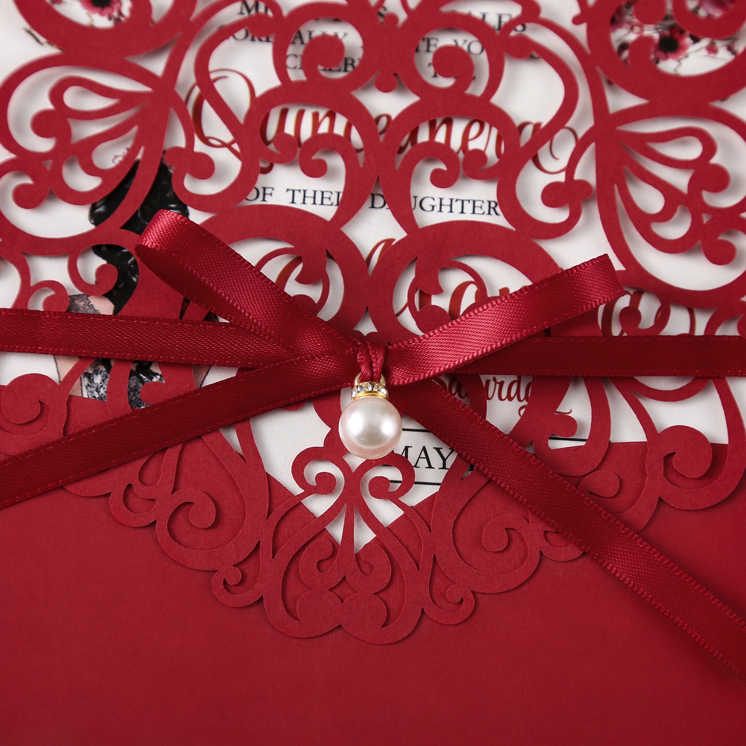 The inner sheet has a bright romantically floral hallway. The oscillating colours of the print come out beautifully on a simply elegant Red leaf pocketed in laser-cut beautiful hollow design. A sleek Red ribbon holds them together with a small delicate Red pearl hanging from the bowknot.